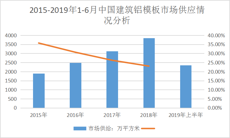 据华夏经纬市场调查公司发布的《2019-2024年中国建筑铝型材市场发展现状及前景规划投资分析报告》数据显示,我国建筑铝膜板市场供给量2015年1900万平方米,截止到2018年增长至超3800万平方米。市场需求从2015年1800万平方米,到2019年上半年我国建筑铝膜板市场需求与2015年一整年市场需求量相当。